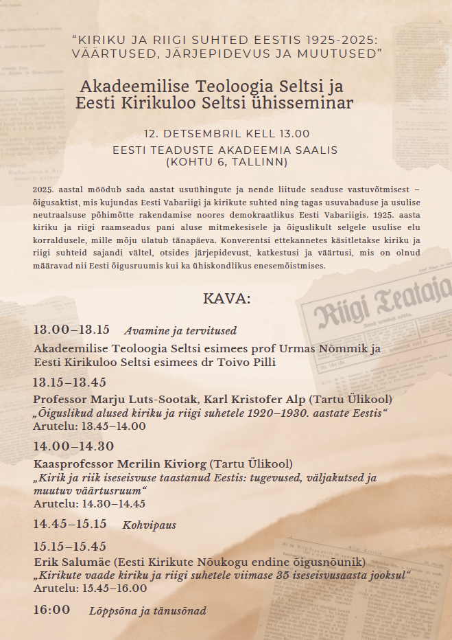 Akadeemiline Teoloogia Selts ja Eesti Kirikuloo Selts kutsuvad 12. detsembril algusega kell 13.00 seminarile teemal „Kiriku ja riigi suhted Eestis 1925–2025: väärtused, järjepidevus ja muutused“. Seminar toimub Eesti Teaduste Akadeemia saalis aadressil Kohtu 6, Tallinn.